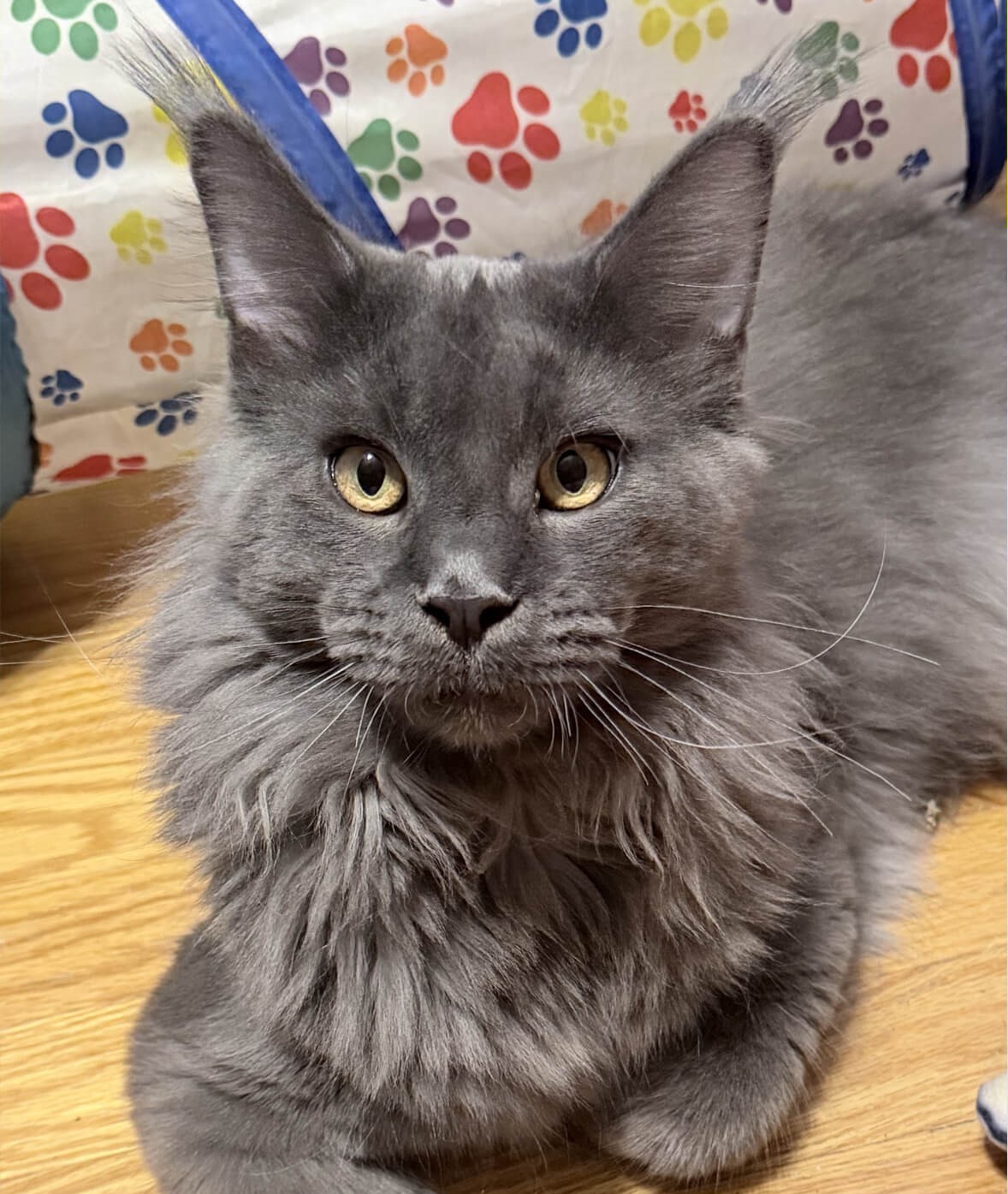 In snowy winters, only long-legged cats with powerful, strong limbs and wide paws resembling snowshoes could move freely. The ears, as the most exposed part of the body to cold, inevitably became more heavily furred. Long hair, inherited from aristocratic ancestors, protected from the cold. But the real pride of Maine Coons is their tail. Perhaps this is exactly the fluffy blanket the cat needed to cover itself in cold winters.