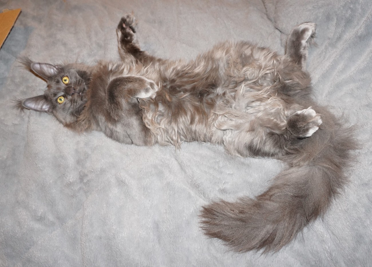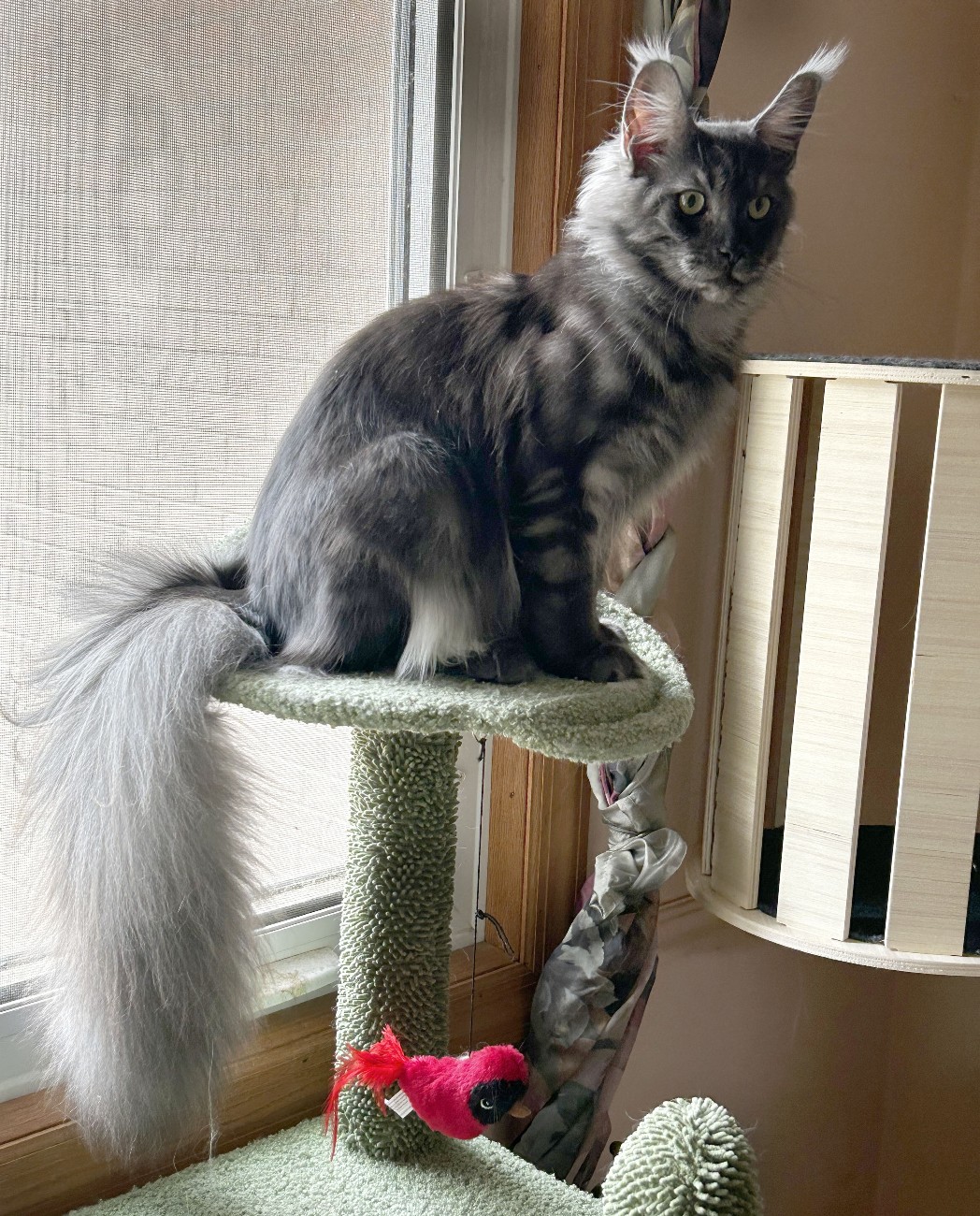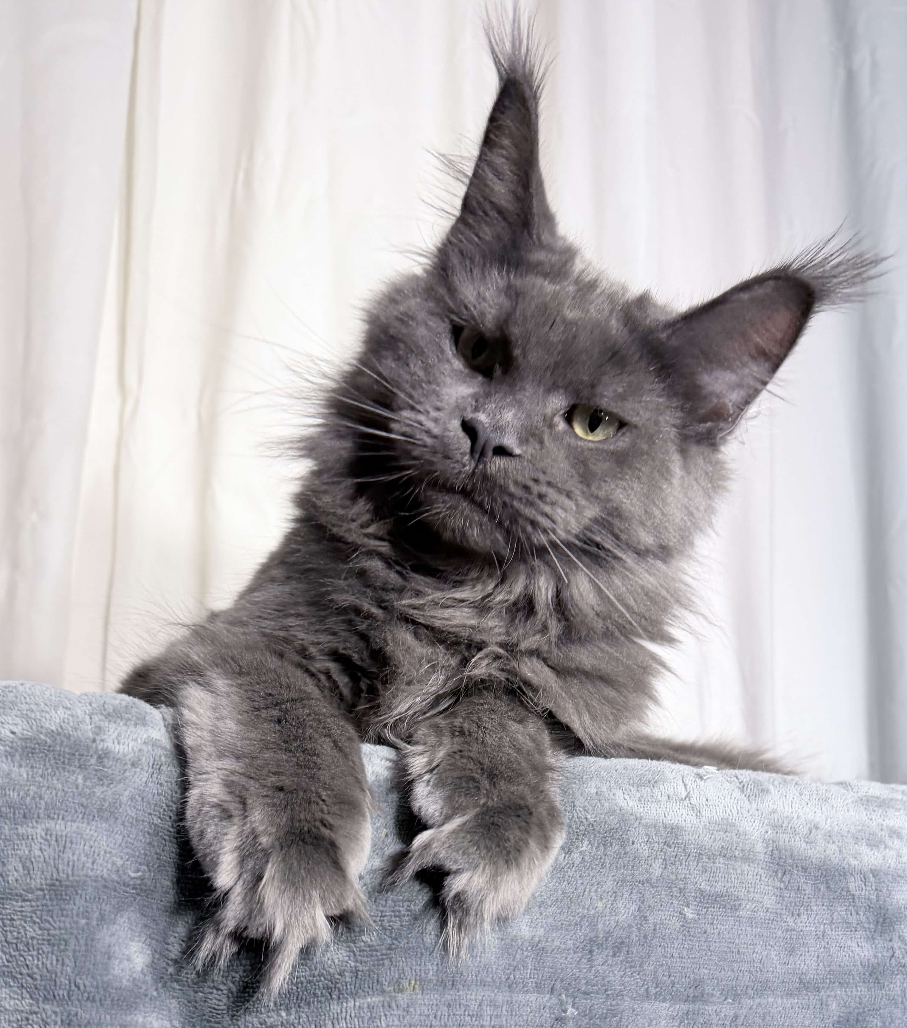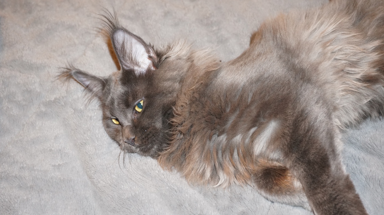 In snowy winters, only long-legged cats with powerful, strong limbs and wide paws resembling snowshoes could move freely. The ears, as the most exposed part of the body to cold, inevitably became more heavily furred. Long hair, inherited from aristocratic ancestors, protected from the cold. But the real pride of Maine Coons is their tail. Perhaps this is exactly the fluffy blanket the cat needed to cover itself in cold winters.