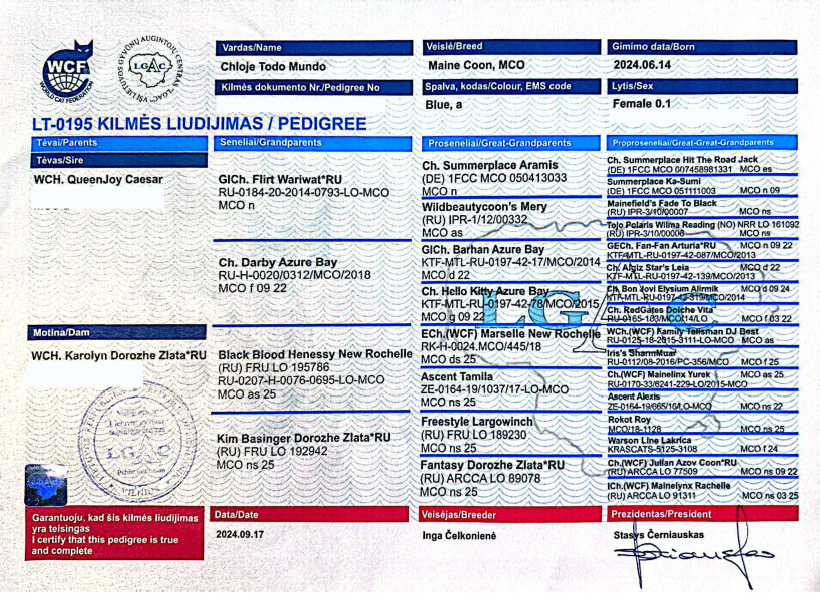 Our pearl is the daughter of multiple World Champion Caesar (WCF) and World Champion Karolyn Dorozhe Zlata (WCF).