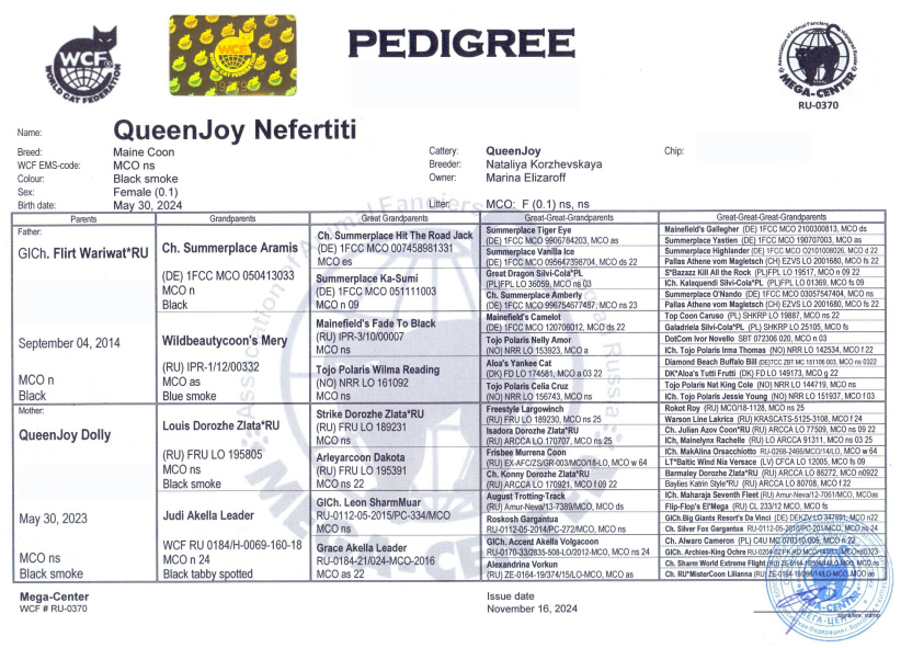 Very kind and affectionate, Nefertiti is also distinguished by her high intelligence, excellent learning ability and the need to communicate with people. A gentle, calm and friendly cat, she loves attention and gets along well with children and other fluffy creatures. She is the daughter of Grand Inter Champion Flirt Wariwat (WCF)