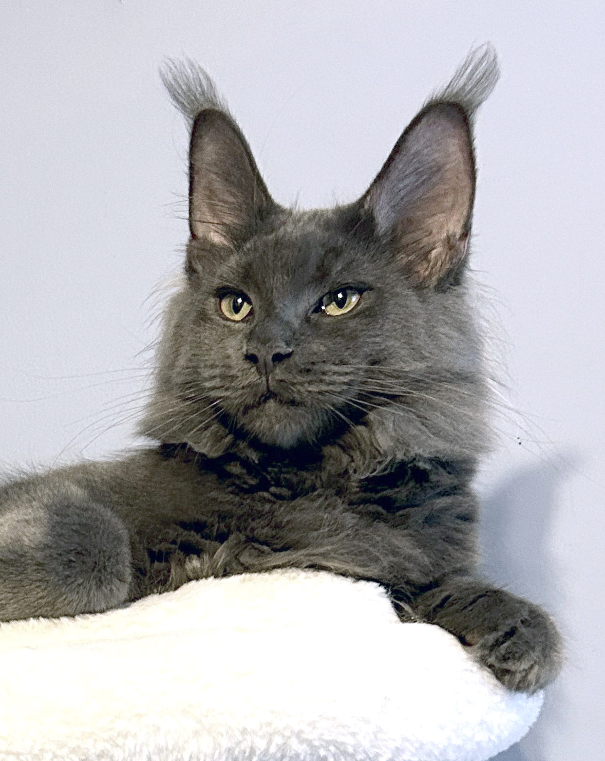 Maine Coon cat is medium to large in size, with a strong build. The fur is thick, silky to the touch, shiny, shorter on the front part of the body, longer on the stomach and hind limbs. There are tassels on the ears, which makes it look like a lynx. Thick tufts of fur in the ears and between the toes are designed to protect against the cold. The paws themselves are wide and strong. Large ears and eyes allow for increased vision and hearing. A relatively long and square muzzle, reminiscent of a lion’s, is convenient for getting prey from holes and water from frozen puddles and streams. It is obvious that the whole appearance of the Maine Coon is in perfect harmony with wild nature.