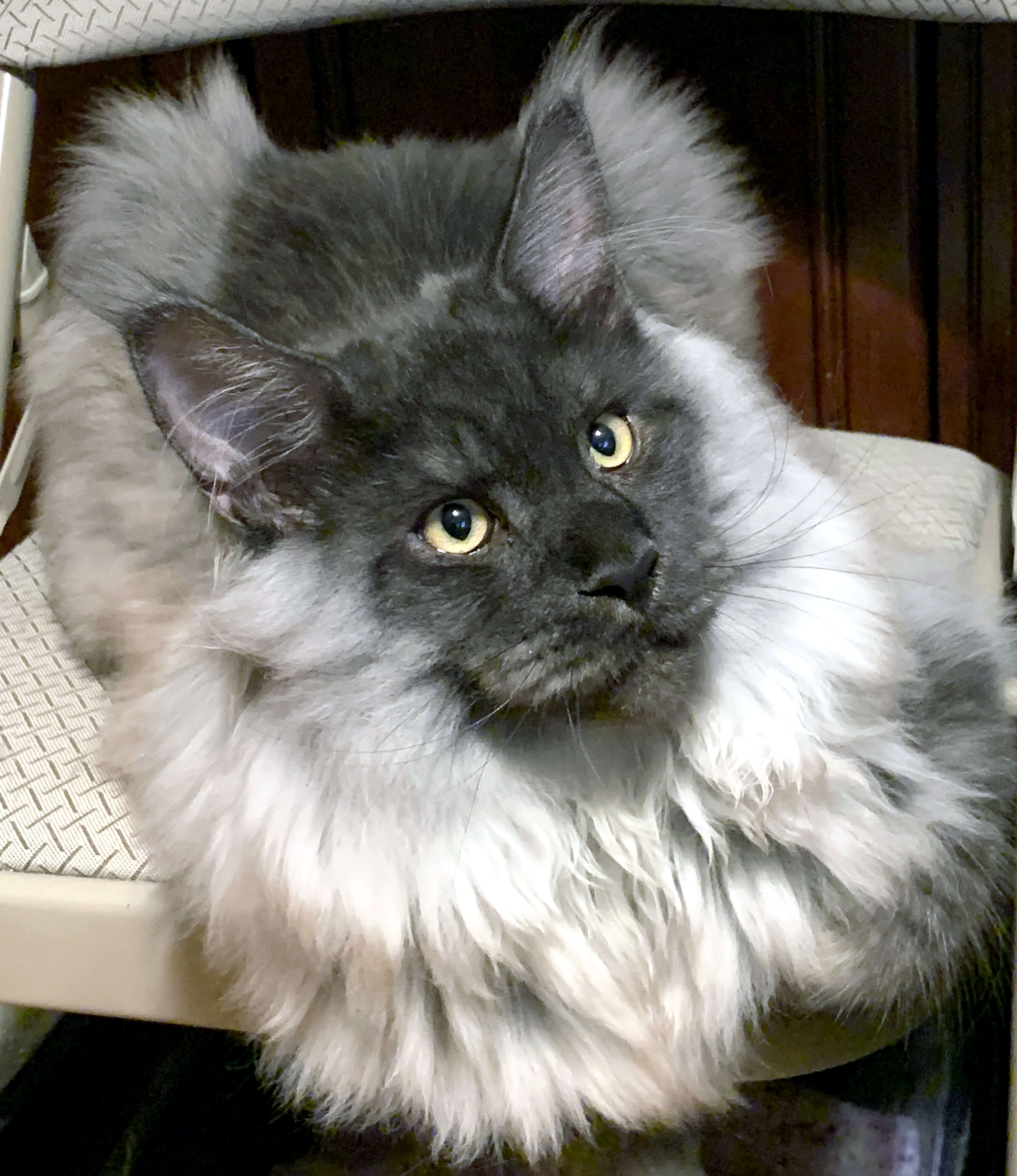 In snowy winters, only long-legged cats with powerful, strong limbs and wide paws resembling snowshoes could move freely. The ears, as the most exposed part of the body to cold, inevitably became more heavily furred. Long hair, inherited from aristocratic ancestors, protected from the cold. But the real pride of Maine Coons is their tail. Perhaps this is exactly the fluffy blanket the cat needed to cover itself in cold winters.